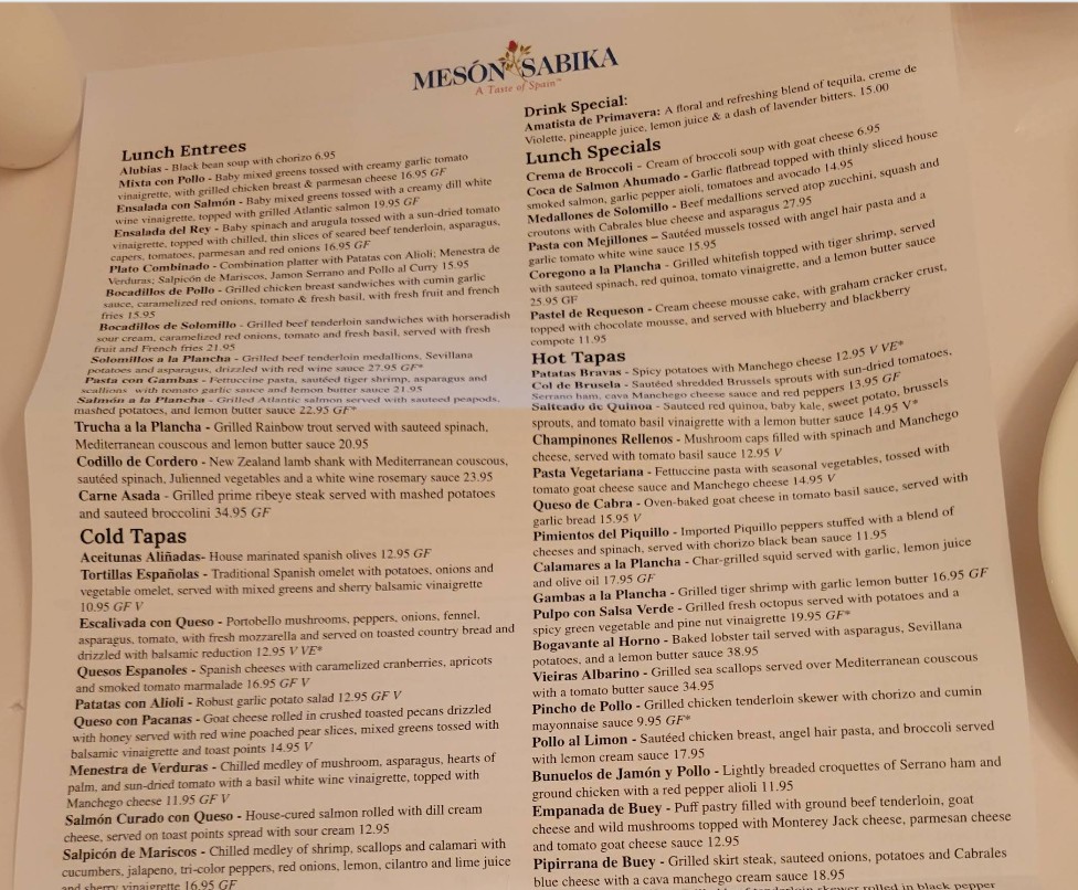 Meson Sabika was an amazing experience from the outside to the inside of the place. The Christmas lights all over the place was amazing. It was our wedding anniversary! They made it special. Made a special card that very nice. We also got some champagne. The food was amazing! The Patatas Bravas, Tortillas Espanola and the Pasta Vegetariana were so good. Highly recommend. The Sangra flight of Red, Prickly Pear, Elderflower and Passion Fruit were so good. Overall 1st class experience. If you are looking for a really spot for your anniversary, birthday or etc. Come here.